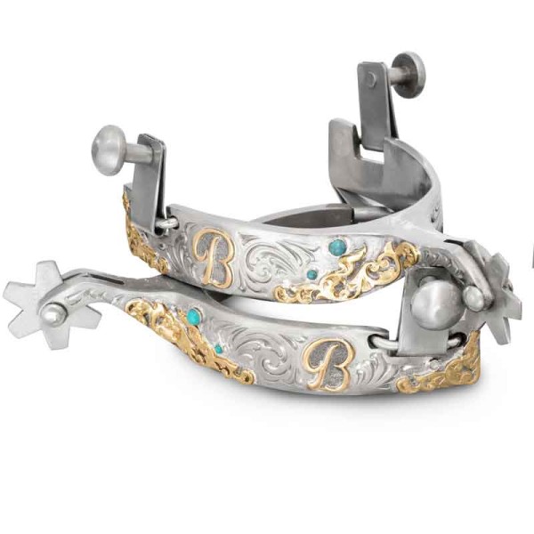 Our Etta Place Spurs make a great gift as well as Trophy Spurs. These beautiful spurs are hand engraved on the entire outside of the band as well as each side of the shanks. We use a light antique finish on these to light up the details! And we can add or delete that from any of our products, just give us a call or put notes in the Special Instructions box! The beauty and functionality of these spurs will last for generations. Choose your lettering, figure, Ranch Brand or Custom Logo for the outside band of each spur.